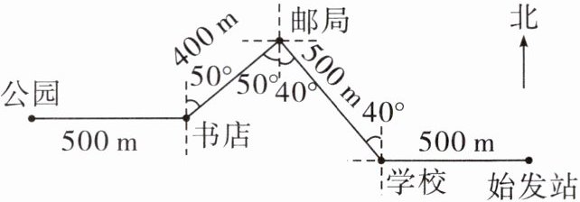 201 路公交车从始发站出发,先向____行驶____m 到达学校,再向____偏____ ____°方向行驶____m 到达邮局,然后向____偏____ 50°方向行驶____m 到达书店,最后向____行驶 500 m 到达公园。
