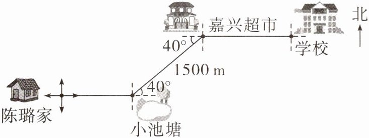 (2) 陈璐从家出发,先向____方向走____m 到达小池塘,接着从小池塘向____偏____ ____°方向走____m 到达嘉兴超市,最后向____方向走____m 到达学校。