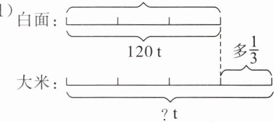 (1)白面: 120 t 多$\dfrac{1}{3}$ 大米: ?t