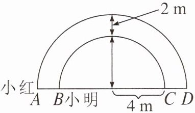 7. 如图,小红和小明分别从$A$、$B$处出发,沿半圆走到$D$、$C$处,小红比小明多走____$\mathrm{m}$。($\pi取3.14$) ( )