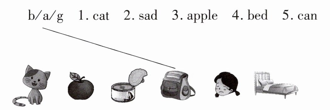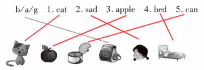 1. c/a/t-猫图;2. s/a/d-女孩哭泣图;3. ap/ple-苹果图;4. b/e/d-床图;5. c/a/n-罐头图