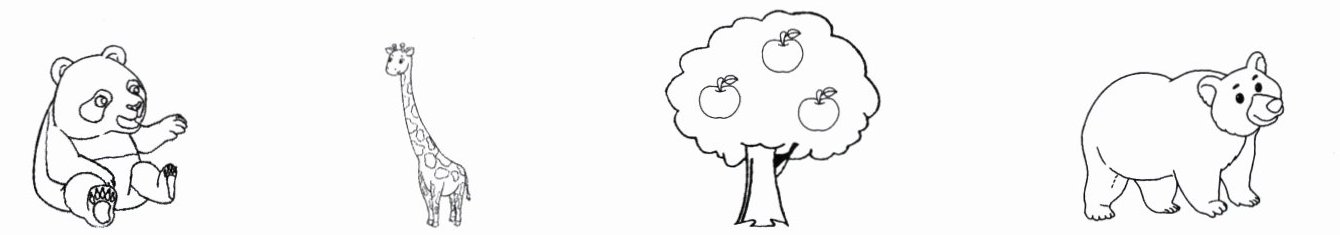 熊猫涂黑色和白色;长颈鹿涂棕色和黄色;树涂绿色,树上的苹果涂红色;熊涂棕色