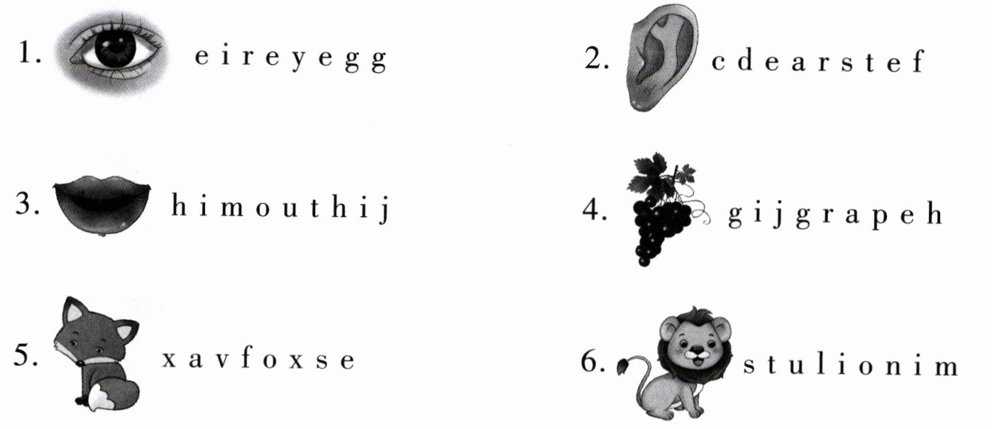 1. eye 2. ear 3. mouth 4. grape 5. fox 6. lion