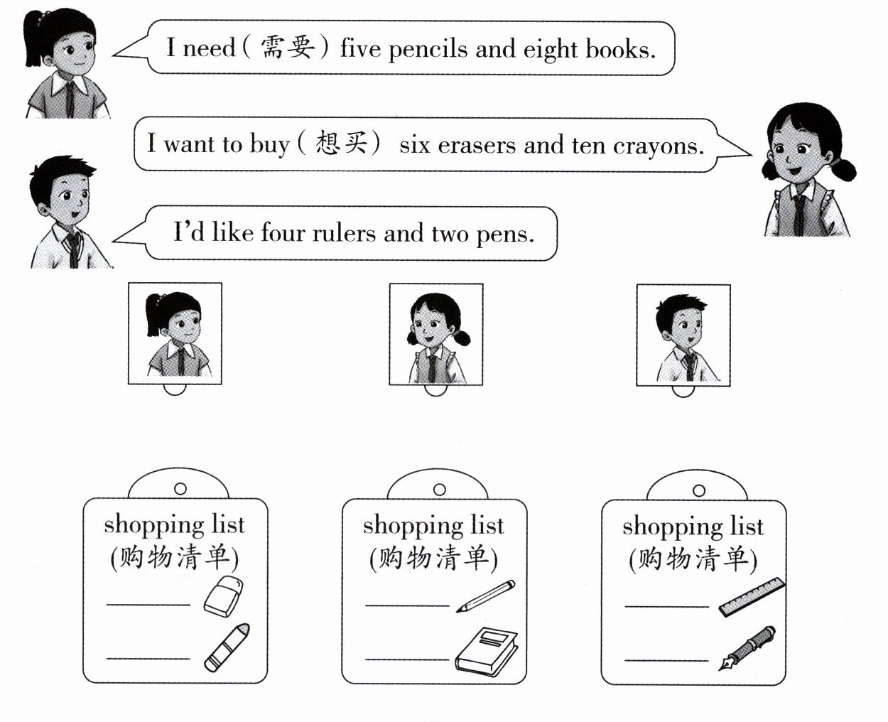 八、小朋友们相约新年去购物。阅读对话,将购物清单与人物连线,并在横线上写出物品数量。(9分)