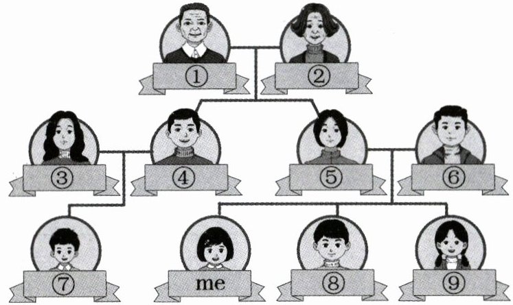 ①grandpa/grandfather ②grandma/grandmother ③aunt ④uncle ⑤mum/mother ⑥dad/father ⑦cousin ⑧brother ⑨sister