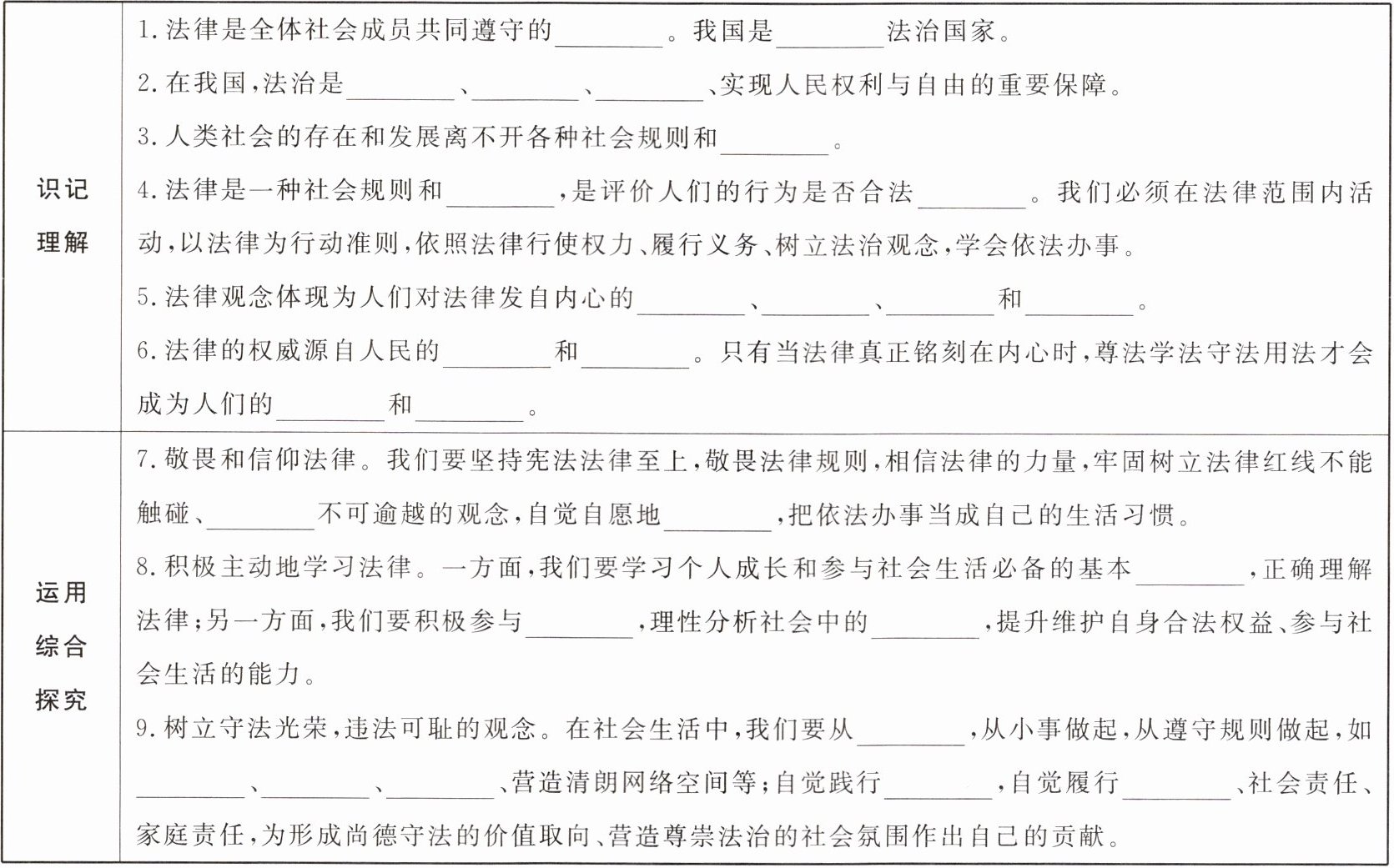 | 识记理解 | 1. 法律是全体社会成员共同遵守的______。我国是______法治国家。