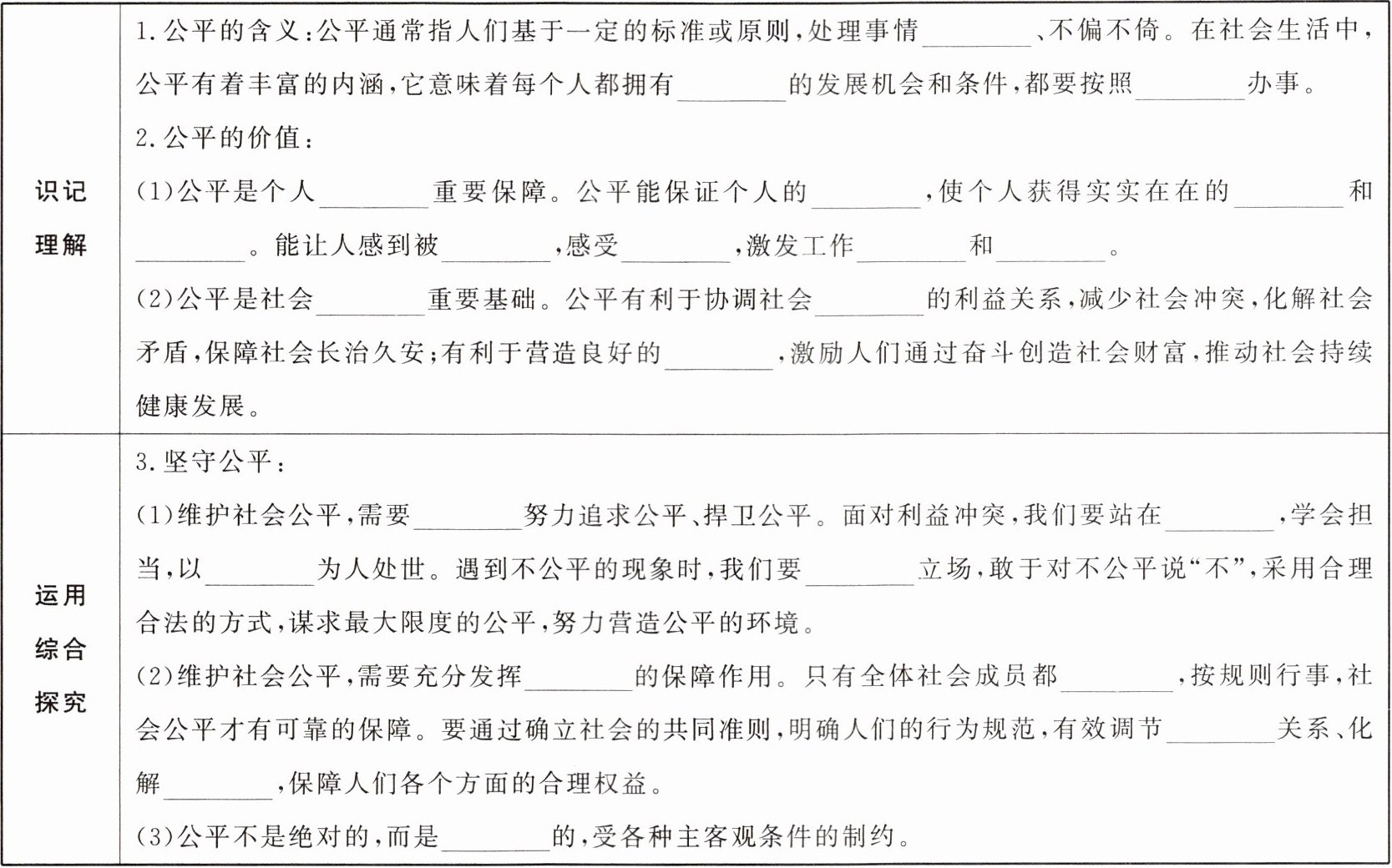 | 识记理解 | 1. 公平的含义:公平通常指人们基于一定的标准或原则,处理事情____、不偏不倚。在社会生活中,公平有着丰富的内涵,它意味着每个人都拥有____的发展机会和条件,都要按照____办事。