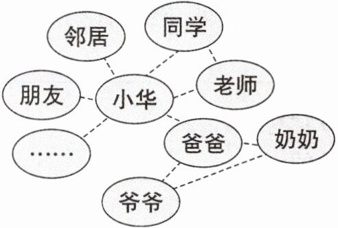 1. 在学习了“我们都是社会的一员”这一部分内容后,小华绘制了自己的社会关系网络图。通过观察小华的社会关系网络图,我们能够发现( )