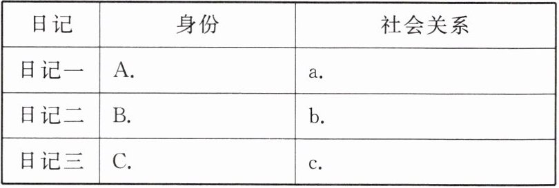 (1)日记一:A.女儿 a.血缘关系;日记二:B.同学 b.业缘关系;日记三:C.居民/业主 c.地缘关系。