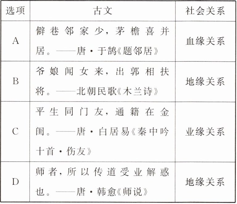 3. 从不同的角度,根据不同的标准,可以将社会关系分为不同的类型。社会关系依据其建立的基础可分为血缘关系、地缘关系和业缘关系。对下列古文中体现的社会关系类型判断正确的是( )