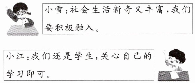 (1)示例:小雪的观点正确。我们的社会生活是丰富多彩、不断变化发展的。我们都是社会的一员。社会为人的生存和发展提供必要条件。每个人都从社会中获得物质支持和精神滋养。社会的发展也离不开每个人的努力。任何一个社会的存在和发展,都是人们共同努力的结果。我们要热爱生活,积极融入社会。不能只关心自己的学习。