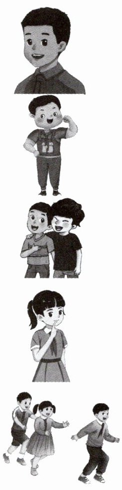 1. short hair 2. tall and strong 3. friends 4. quiet 5. playing