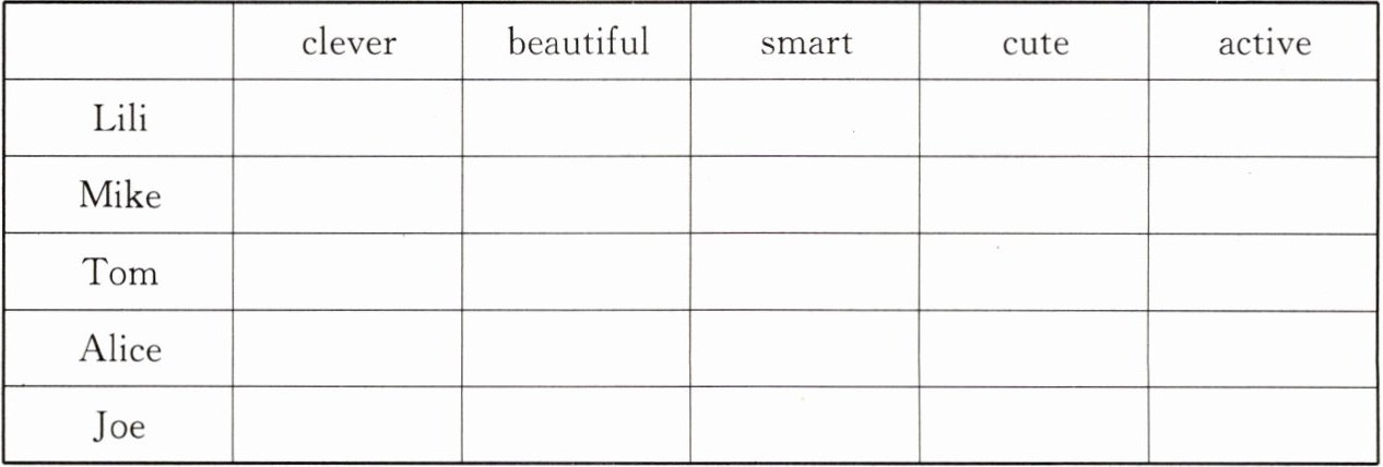 三、Listen and tick. 听录音,在与你所听内容相符的人物特点处画“√”。