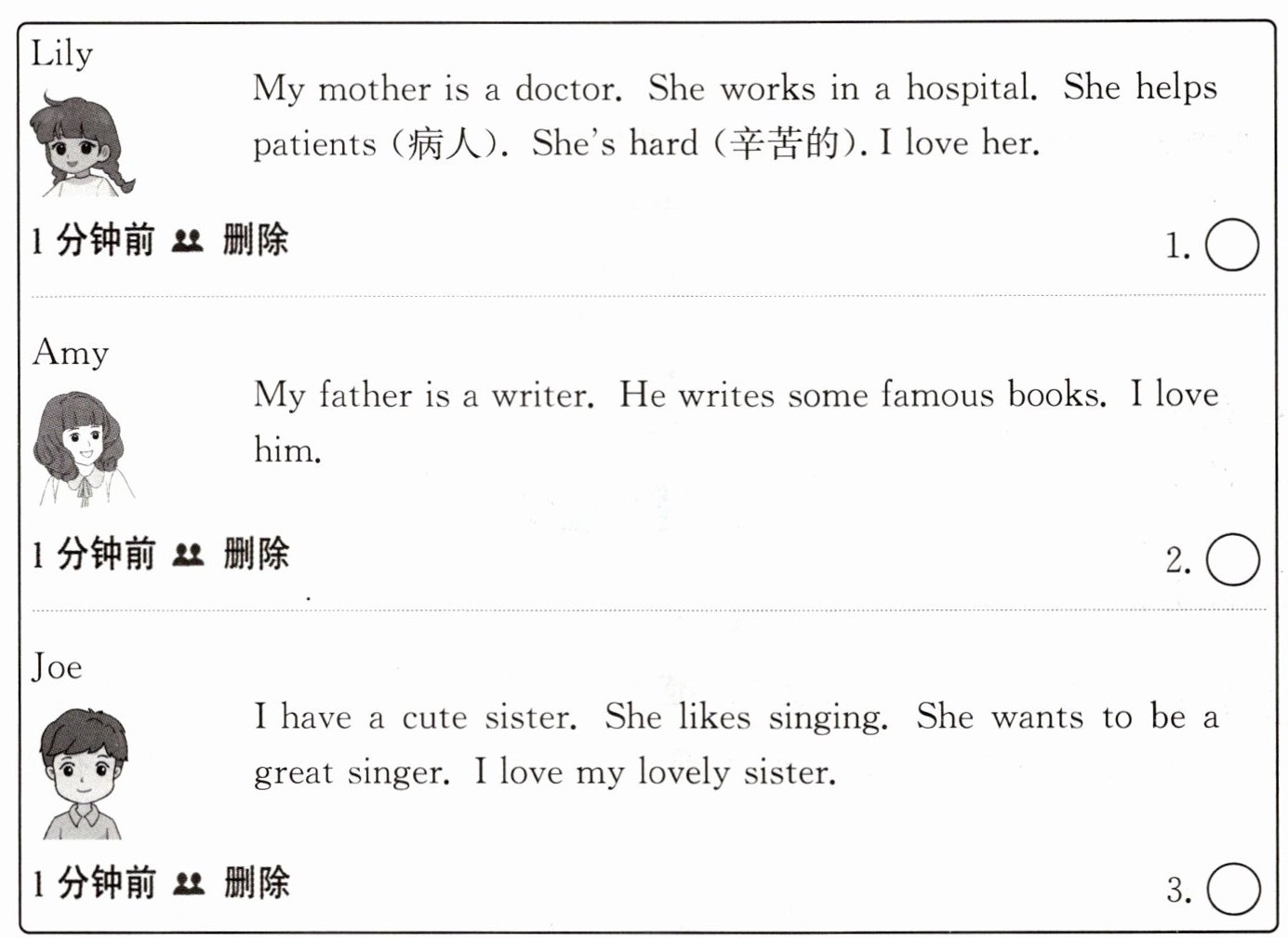 | Amy | My father is a writer. He writes some famous books. I love him. | 1 分钟前 删除 | 2. ○ |