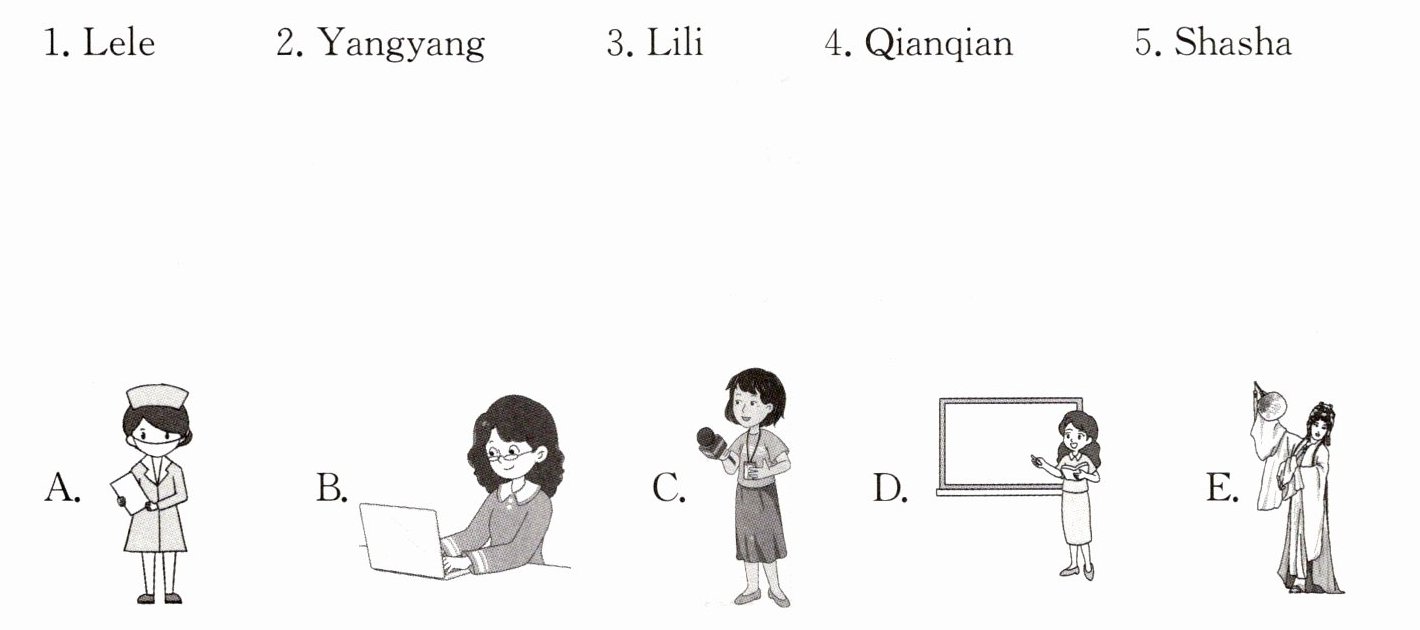 二、Listen and match. 听录音,将小朋友们与他们的妈妈对应的职业连线。