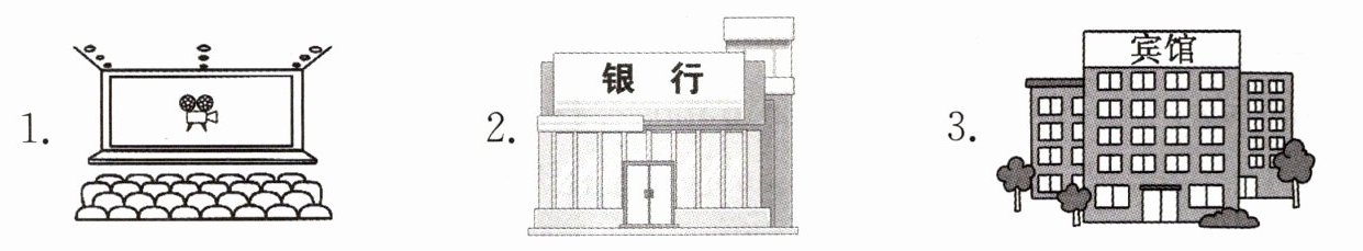 1. cinema 2. bank 3. hotel