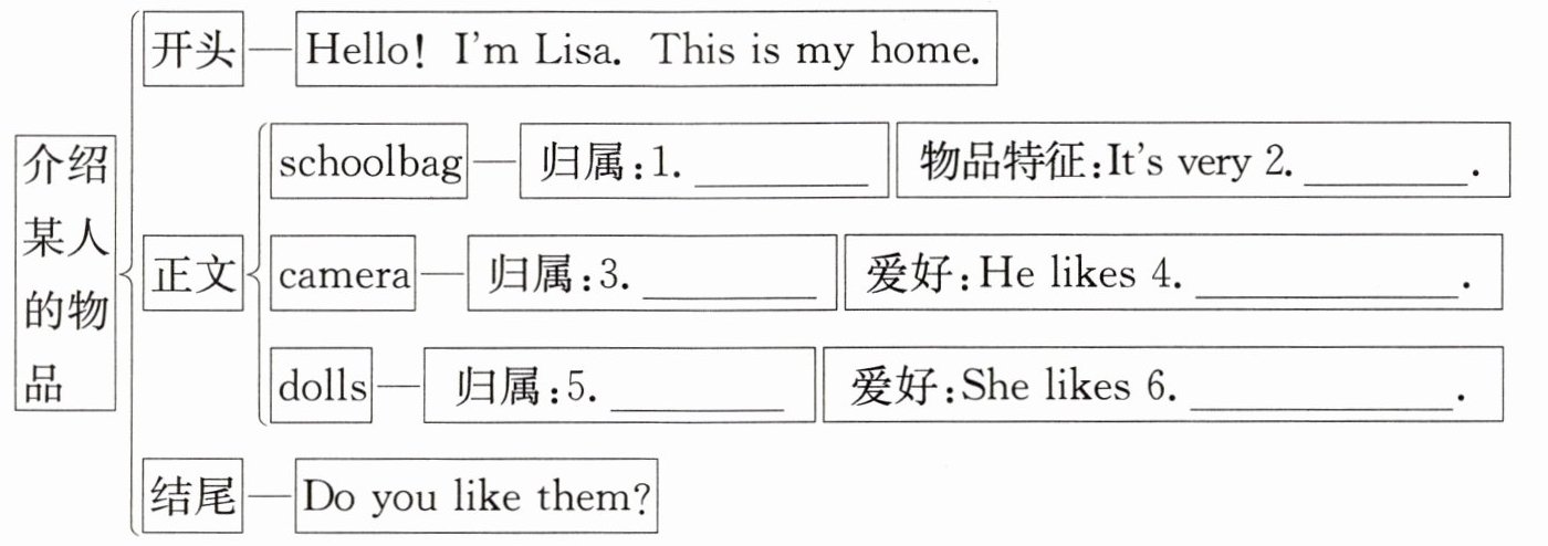 ├─camera─归属:3. ____─爱好:He likes 4. ____.