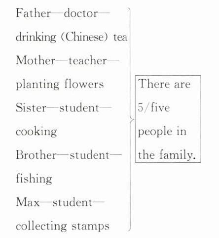 My name is Max. I'm a student. I'm from Canada. I have a happy family. Now let me tell you about my family. There are five people in my family. My father is a doctor. His hobby is drinking Chinese tea. My mother is a teacher. Her hobby is planting flowers. My sister and my brother are students. My sister's hobby is cooking. My brother likes fishing. My hobby is collecting stamps. How about you and your family? Can you tell me?