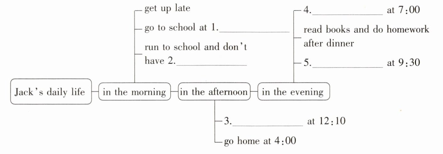I'm Jack. I'm unhappy. I often get up late in the morning and go to school at 8:50. School begins at 9:00. So I often run to school, and I don't have breakfast. After three lessons, I have lunch at 12:10. School is over at 3:30 in the afternoon. Then I go home at 4:00. I have dinner at 7:00 in the evening. After dinner, I read books for 30 minutes and do my homework. Then I go to bed at 9:30.