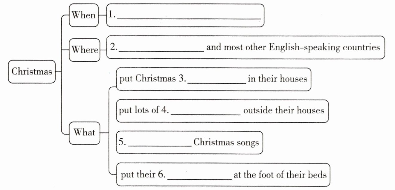 任务一:1. on December 25th 2. in the UK 3. trees 4. lights 5. sing 6. stockings 任务二:1. F 2. F
