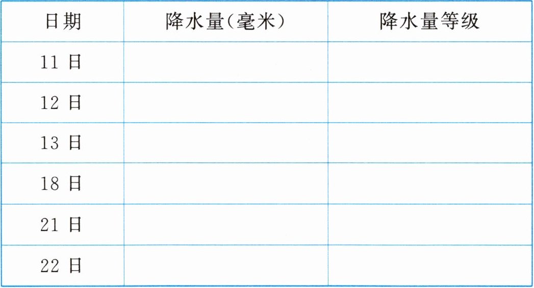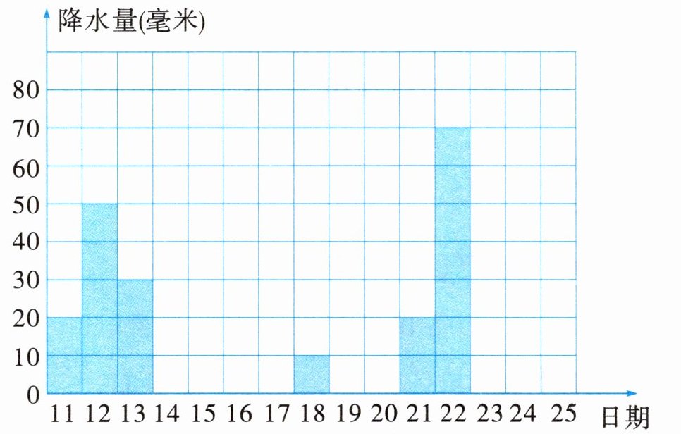 20毫米(11日、21日)、10毫米(18日)属于中雨;30毫米(13日)属于大雨;50毫米(12日)、70毫米(22日)属于暴雨。