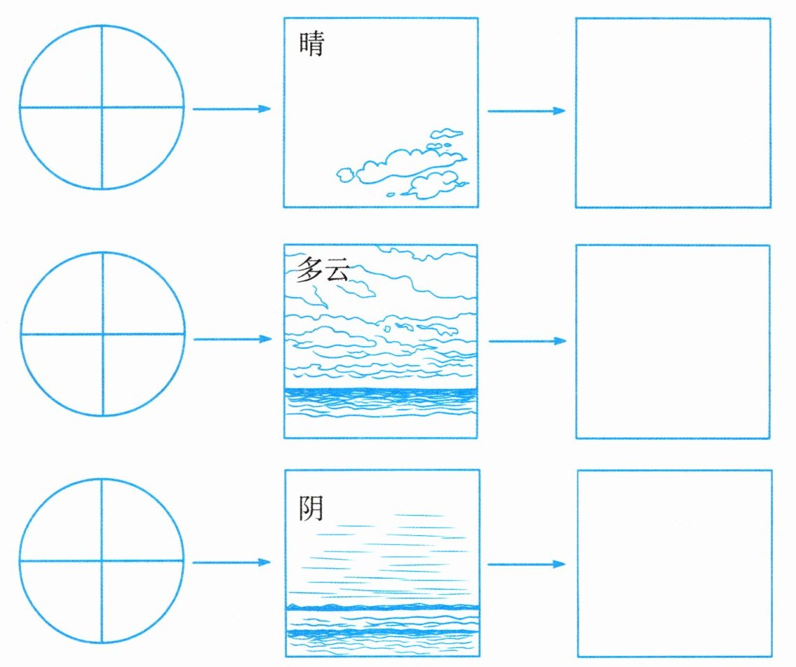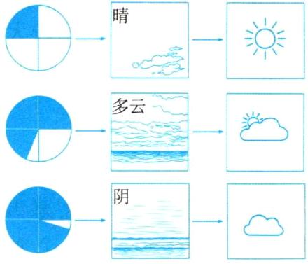 1. 观察云量图片,把天空当成一个圆,平均分成四份,请你把看到的云量填充到下列圆面内,按照云在天空中所占的多少区分天气情况,并在方框中简单画一画这种天气。
