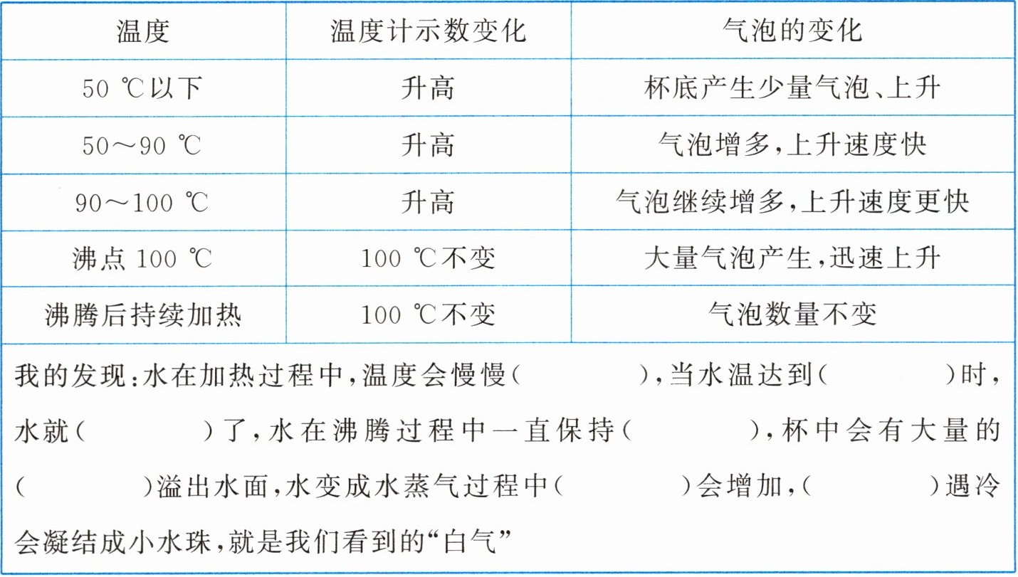 解析:水在加热过程中,温度会慢慢升高,当水温达到100°C时,水就沸腾了。水在沸腾过程中一直保持100°C,杯中会有大量的气泡溢出水面,水变成水蒸气的过程中体积会增加,水蒸气遇冷会凝结成小水珠,就是我们看到的“白气”。