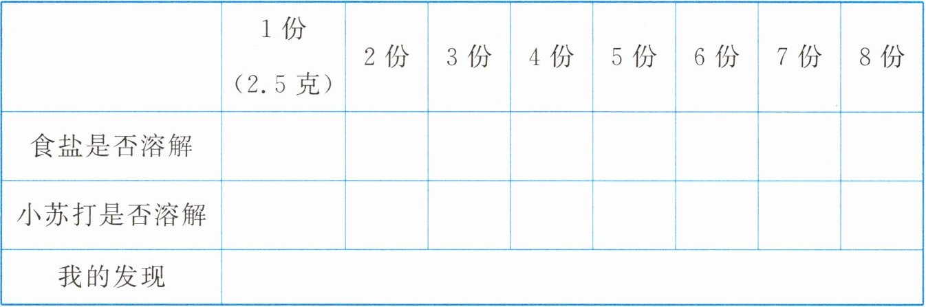 1.1份(2.5克)2份3份4份5份6份7份8份食盐是否溶解√√√√√√√×小苏打是否溶解√√××××××我的发现食盐和小苏打溶解的份数不同,50毫升的水中能溶解大约18克食盐(7份左右),能溶解约5克小苏打(2份左右)。食盐在水中的溶解能力比小苏打强
