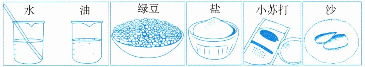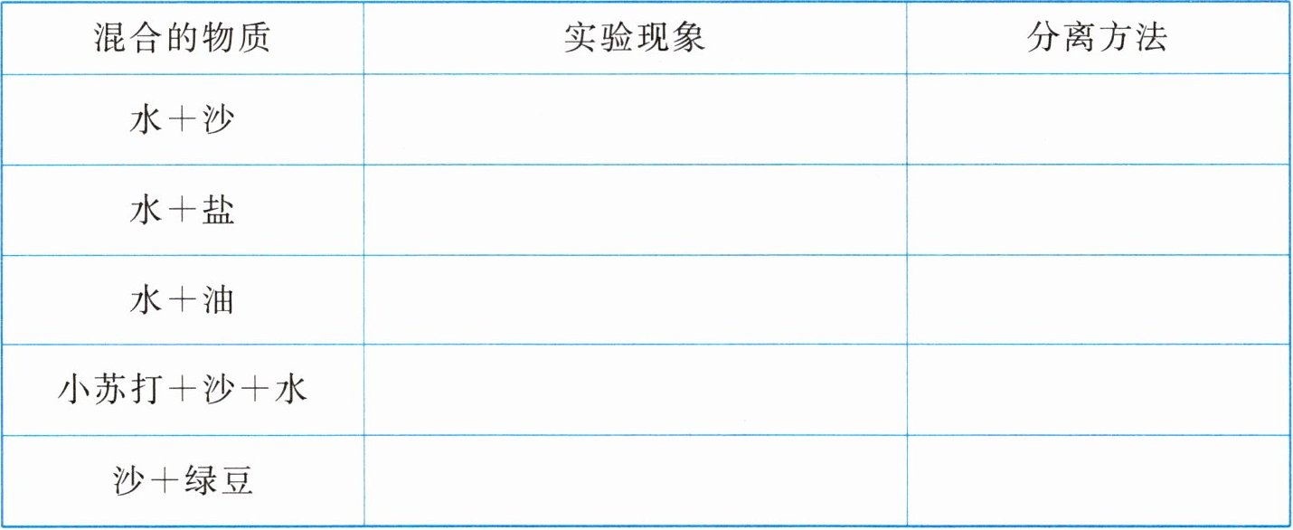 (4)食盐 2. 混合的物质 实验现象 分离方法 水+沙 完全分开,不可混合 过滤 水+盐 可以混合 蒸发 水+油 油在水上,不可混合 静置 小苏打+沙+水 沙在下面,不可混合;水和小苏打可混合 过滤;蒸发 沙+绿豆 完全分开,不可混合 筛子筛