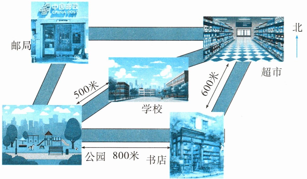 小明和小红从学校出发,要先向西南方向走500米到达公园后,再向东南方向走800米到达书店。