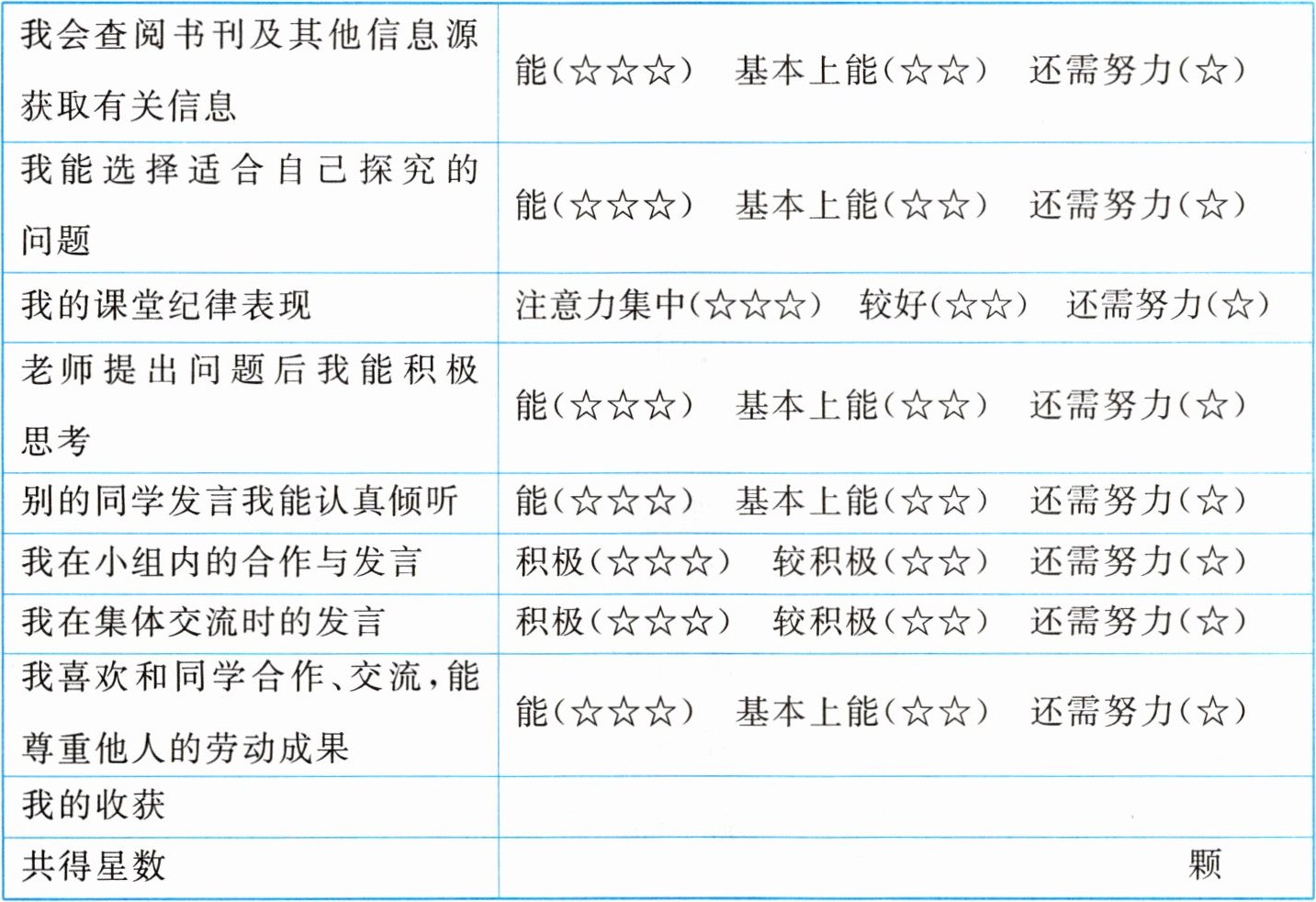 (注:表格中星级选择示例:查阅信息☆☆、选择问题☆☆☆、纪律☆☆☆、思考☆☆☆、倾听☆☆、小组合作☆☆☆、集体发言☆☆☆、合作尊重☆☆☆,合计2+3+3+3+2+3+3+3=22颗)