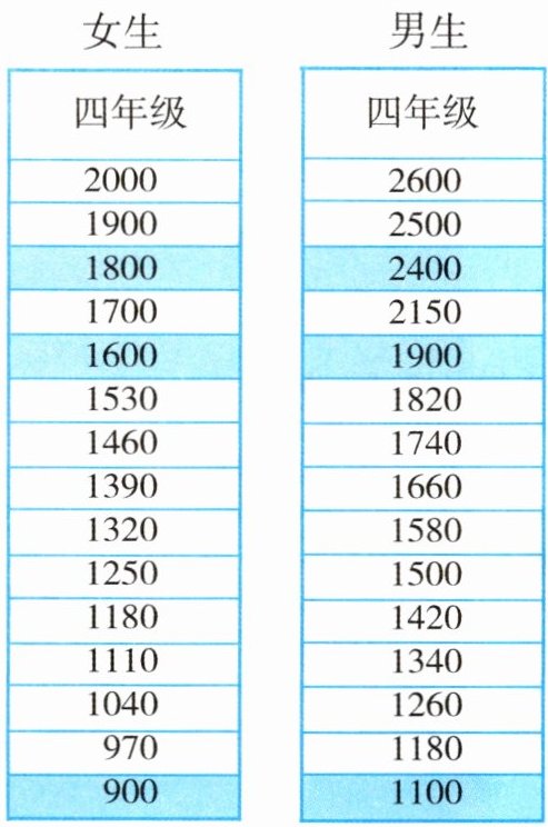 这是国家学生体质健康标准中,小学四年级男生和女生的肺活量数据。(单位:毫升)