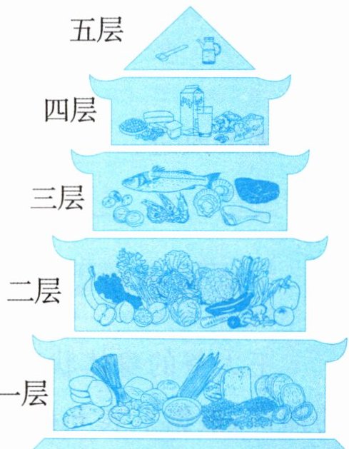 1. 如图是中国居民“平衡膳食宝塔”,它为我们提供了一个营养配比的参考标准,请分析“平衡膳食宝塔”,试着分析以下问题。