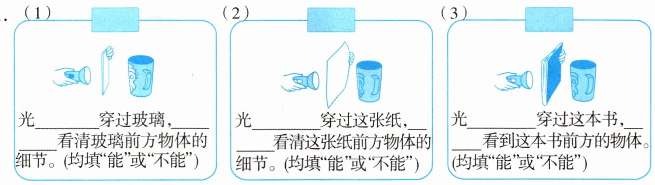 (3) 光______穿过这本书,______看到这本书前方的物体。(均填“能”或“不能”)