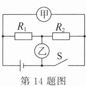 14. 如图所示,当 $ S $ 断开,甲、乙两表均为电流表时,两表示数比为 $ I_{甲} : I_{乙} = 3 : 5 $,则 $ R_1 $ 和 $ R_2 $ 电阻比为______,此时 $ R_1 $ 和 $ R_2 $ 的功率之比 $ P_1 : P_2 = $______。当 $ S $ 闭合,甲、乙两表均为电压表时,两表示数之比为 $ U_{甲} : U_{乙} = $______,此时 $ R_1 $ 和 $ R_2 $ 的功率之比 $ P_{甲} : P_{乙} = $______。