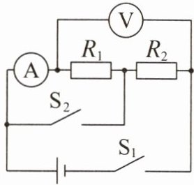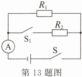 13. 如图所示的电路中,电源电压保持不变。只闭合开关 $ S $,电流表的示数为 $ 0.1 A $;再闭合开关 $ S_1 $,电流表的示数变为 $ 0.5 A $。$ S $、$ S_1 $ 均闭合后,在相同的时间内,电流通过电阻 $ R_1 $、$ R_2 $ 所做电功之比为______。