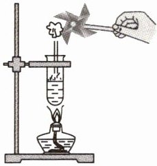 【实验操作过程】用铁架台将一个试管固定,在试管内装些水,用带玻璃管的胶塞塞住,在玻璃管口处放一个纸做的小叶轮,在底部用酒精灯加热试管,使水沸腾。