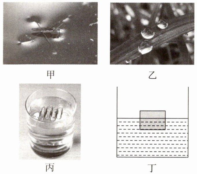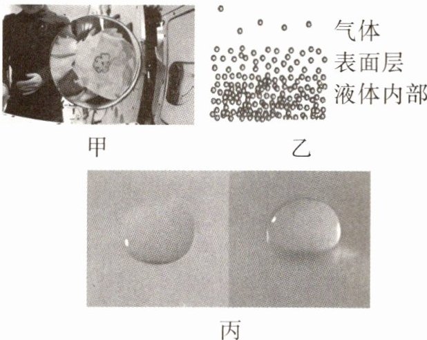 液体跟气体接触的表面存在一个薄层,叫作表面层,如图乙所示,表面层里的分子比液体内部稀疏,表面层分子间的相互作用表现为引力。就像你要把弹簧拉开些,弹簧反而表现收缩的趋势。由于分子间的相互作用,液体会产生使表面尽可能缩小的力,这个力称为表面张力,水膜形成的本质原因是液体的表面张力。