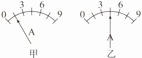 ★★20. 某电流表有两个测量范围,只知道大测量范围是$0\sim9A$,小测量范围刻度值未标明。小聪为了探究电流表的小测量范围是多少,他先用大测量范围测一较小的电流,其示数如图甲所示,再改用小测量范围测同一电流,指针指在图乙所示的位置。