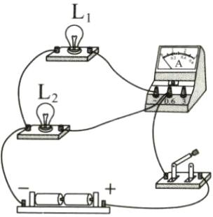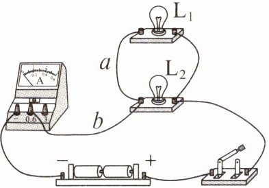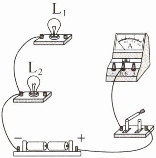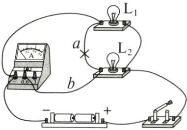 ★★19. 如图所示,小红同学要测量通过灯$L_2$的电流,只允许改接一条导线,在需改动的导线上打“$×$”,请用笔画线代替导线完成电路连接。