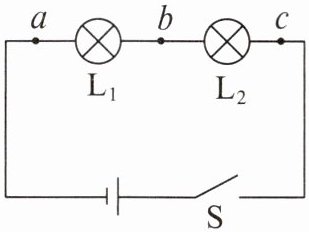2. 小林同学利用如图所示电路探究“串联电路中用电器两端电压与电源两端电压的关系”,电源电压 $ U = 6 \, V $ 保持不变。他闭合开关时发现两只灯泡都不亮,用电压表测出 $ ab $、$ bc $、$ ac $ 两点之间的电压分别为 $ U_{ab} = 6 \, V $、$ U_{bc} = 0 \, V $、$ U_{ac} = 6 \, V $。若电路中只有一处故障,则应是( )