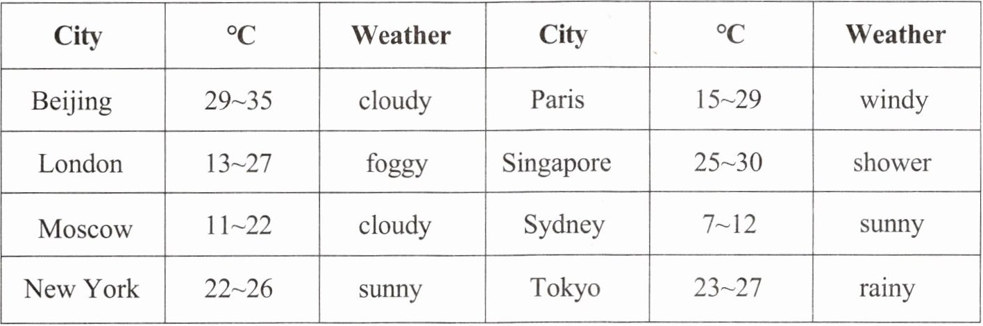 | Beijing | 29~35 | cloudy | Paris | 15~29 | windy |