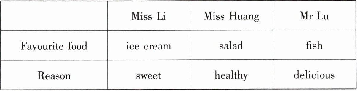 Miss Li's favourite food is ice cream. She likes it because it is sweet. Miss Huang's favourite food is salad. She likes it because it is healthy. Mr Lu's favourite food is fish. He likes it because it is delicious.