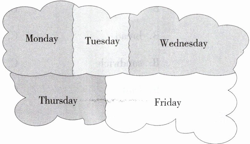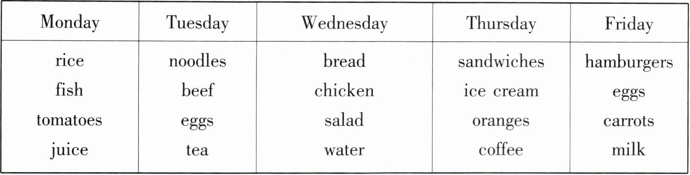 2. Tuesday(周二布告栏):画一碗noodles(面条)、一些beef(牛肉)、几个eggs(鸡蛋)、一杯tea(茶)。