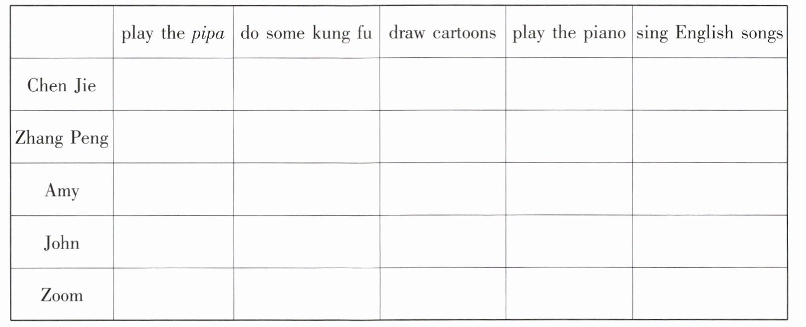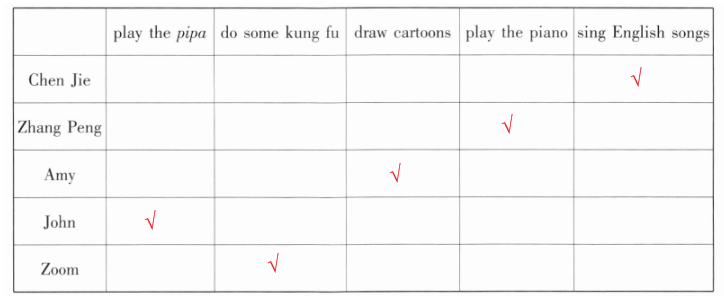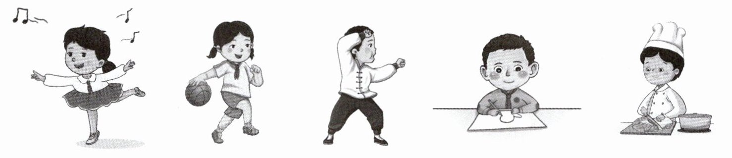 1. party 2. play 3. cartoons 4. kung fu 5. sing