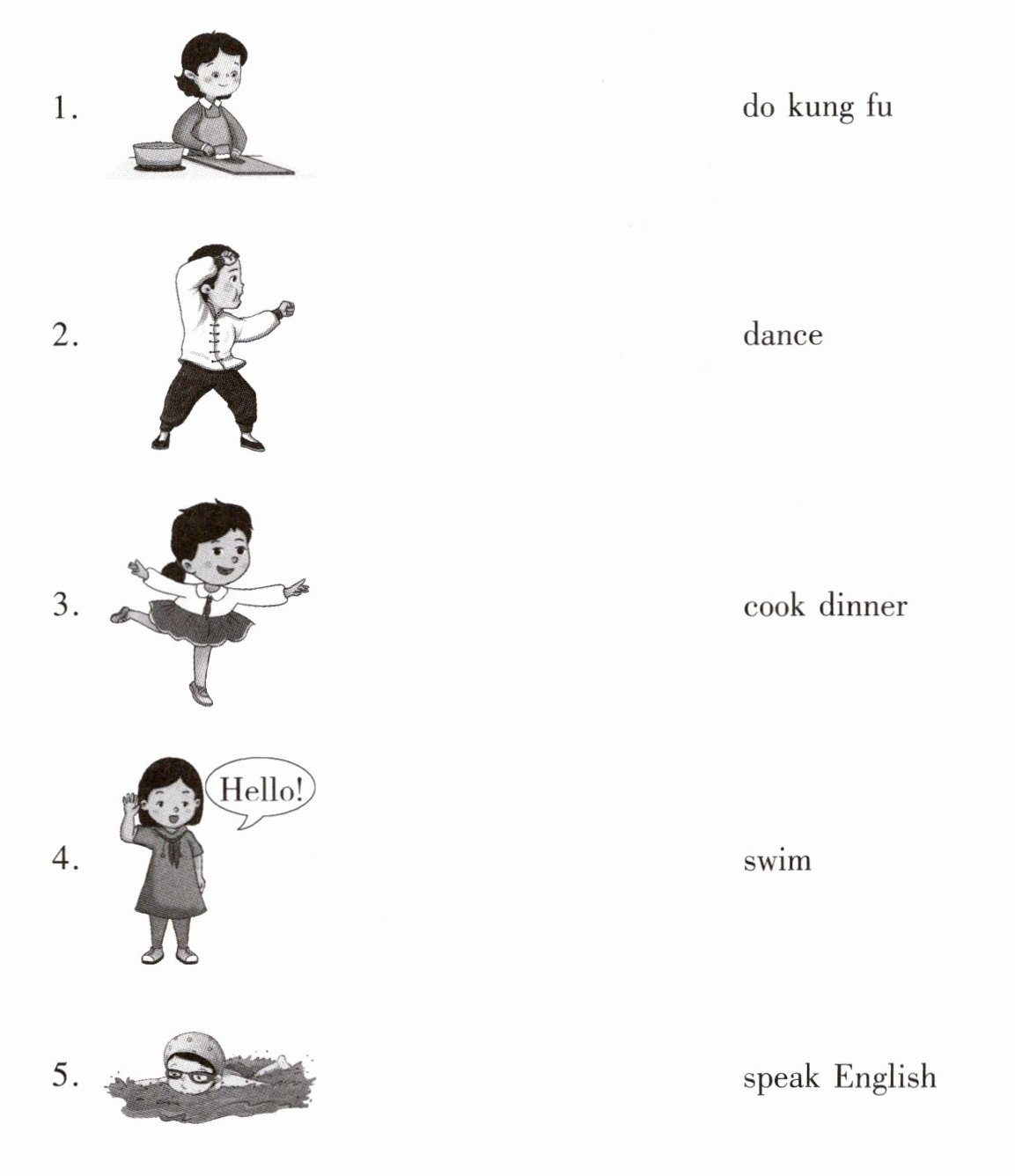 1-cook dinner; 2-do kung fu; 3-dance; 4-speak English; 5-swim