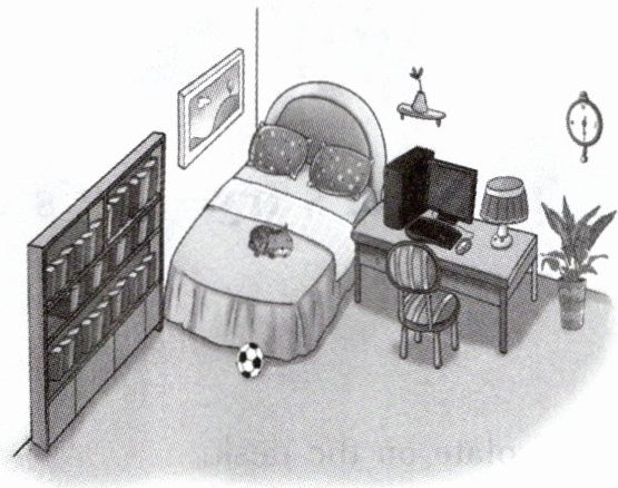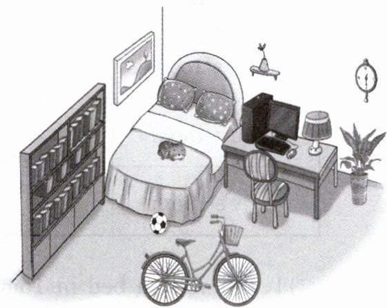 1. bed 2. plant 3. bike 4. clock 5. computer 6. photo 7. books (本题答案不唯一。)