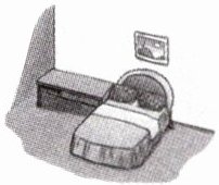 1. plate on 2. ruler in 3. above the bed 4. under the bed 5. beside the door