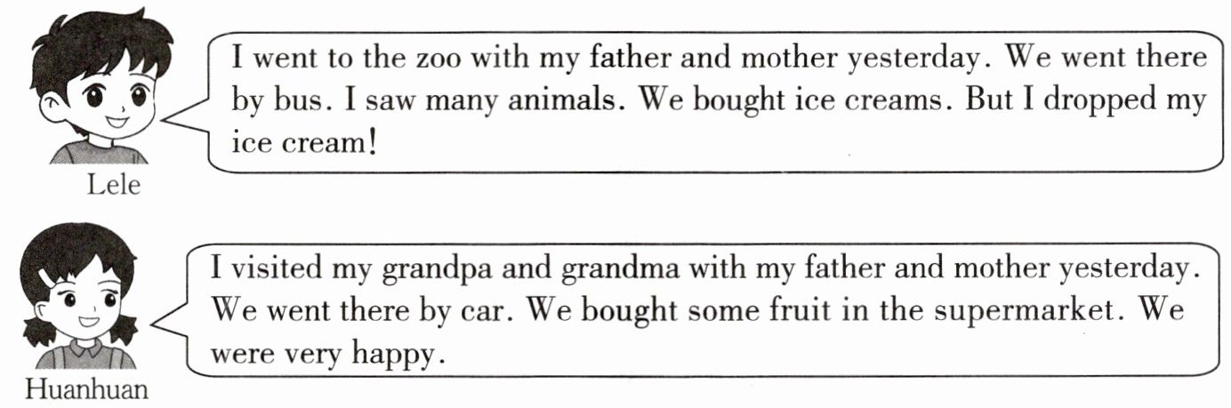 Lele: I went to the zoo with my father and mother yesterday. We went there by bus. I saw many animals. We bought ice creams. But I dropped my ice cream!