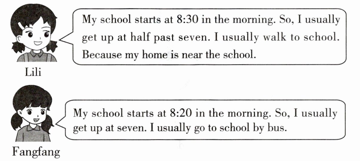 四、Read and finish. Lili 和 Fangfang 正在谈论一些日常活动安排的时间。阅读下面两段独白,完成下列任务。